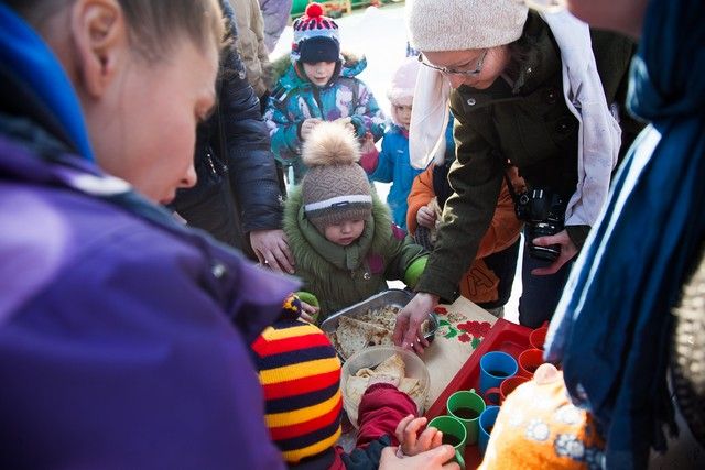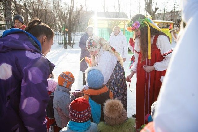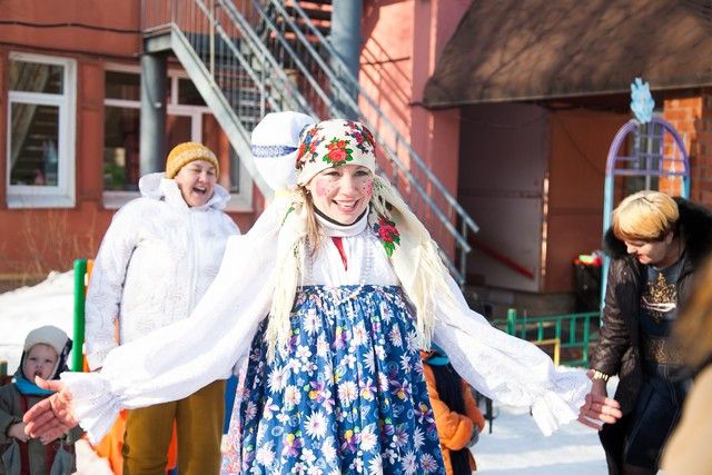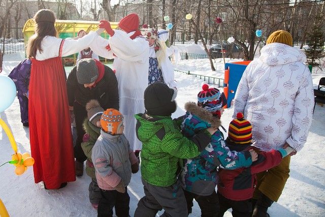 Погода выдалась под стать празднику: было тепло и солнечно, поэтому малыши – от совсем крох до «почти взрослых» шестилетних — высыпали на улицу, и принялись бегать, играть и валяться в сугробах.