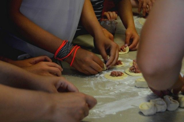 Этот сезон проекта был примечателен тем, что некоторые блюда мы и сами готовили впервые, то есть учились на ходу вместе с ребятами. На последней встрече народу было больше, чем обычно, и ребята сами разделились на 3 группы: первые вместе с Богданом раскатывали тесто и вырезали кружочки, мы со второй группой раскладывали начинку и лепили манты, а третья группа с двумя Машами и Юлей учились делать красивые… селфи. В итоге все 3 группы остались довольны и манты ели уже, конечно же, вместе.