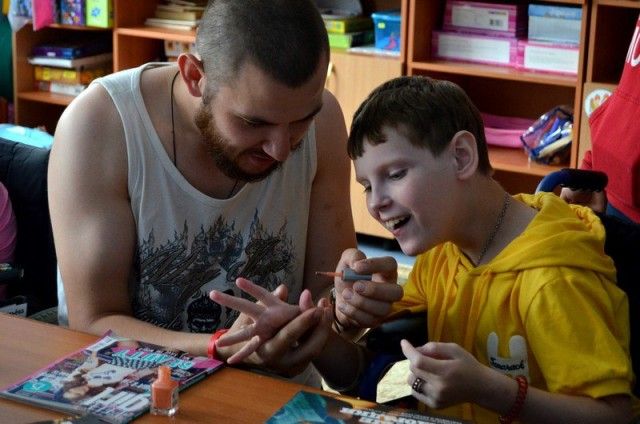 Пока Саша и Богдан готовили вместе с самыми активными ребятами, мы пошли со старшими девочками в игровую. Подарили им журналы и вместе начали их смотреть. Там было много про красоту, и мы решили, что можем не хуже, чем на картинках. И начали красить девчонкам ногти. Вдруг к нам зашел наш повар Саша. Мы ему в шутку предложили присоединиться, а он неожиданно и с удовольствием согласился. В итоге — почти идеальный маникюр, сделанный сашиными руками, исключительно довольная его обладательница и куча позитива.
