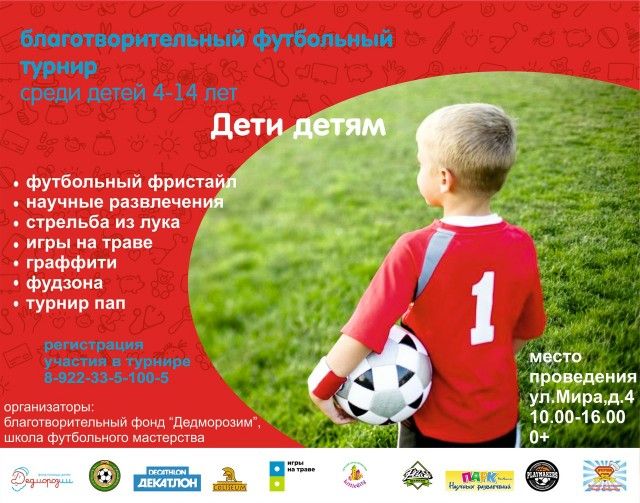 В эту субботу, 17 сентября, юные футболисты – вместе с родителями и болельщиками – поборются за детское здоровье. На поле выйдут и самые маленькие игроки, и самые взрослые: детские соревнования пройдут для ребят от 4 до 14 лет, а после в игру вступят папы всех возрастов. Организовать детский футбольный турнир (и, по совместительству, большой детский праздник) «Дети – детям» решили в «Школе футбольного мастерства».