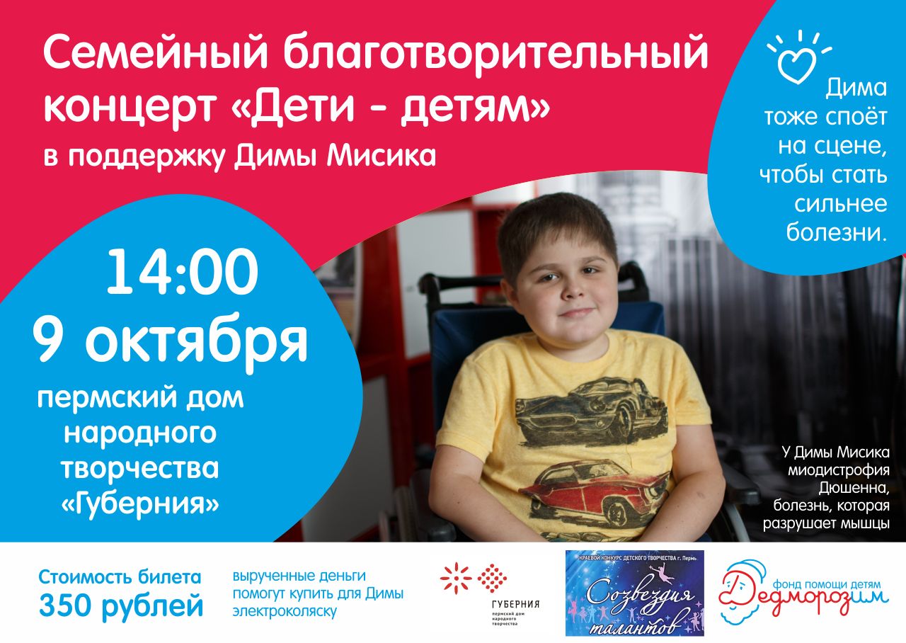 В воскресенье, 9 октября, десятилетний Дима Мисик, который болен миодистрофией Дюшенна, поднимется на сцену. Мальчик будет петь, чтобы стать сильнее болезни, которая лишила его возможности ходить. Поддержать Диму в трудный момент решили творческие коллективы Перми. Как и сам мальчик, они станут участниками Семейного благотворительного концерта и помогут собрать деньги на покупку электроколяски, которую Диме порекомендовали врачи.