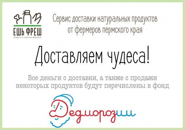 Привозить шанс на чудо туда, где вы живёте, придумала команда сервиса доставки фермерских продуктов «Ешь фреш». В течение двух недель — с 14 по 27 ноября — вся стоимость доставки будет перечисляться на помощь детям в фонд #дедморозим.
