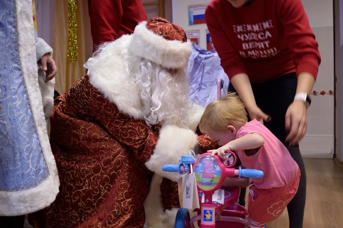 Глаза у ребят горели ярче огней на елочке, когда Дед Мороз начал дарить заветные пакеты и коробки. Некоторые подарки были размером больше самих получателей и нести их помогали взрослые. Что-то, как например, велосипед, было освоено и протестировано сразу же. Причем малышка, мечтавшая о велосипеде, не только немедленно покаталась на нем сама, но и разрешила это сделать своим друзьям.