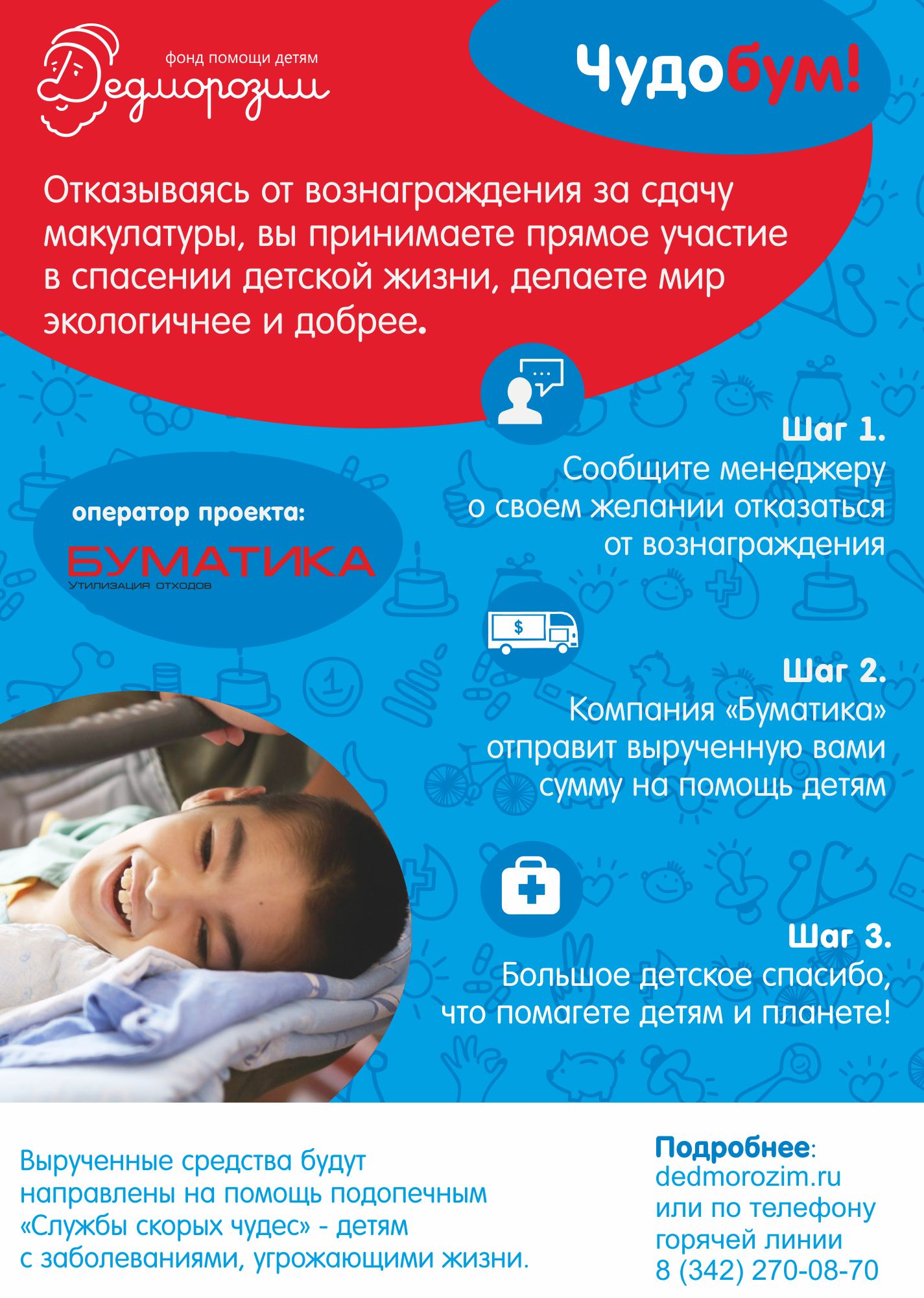 Чтобы совершить чудо, отправив старую бумагу на доброе дело, обратитесь в компанию «Буматика». Уточните подробности на сайте или позвоните по телефону 2-700-008.