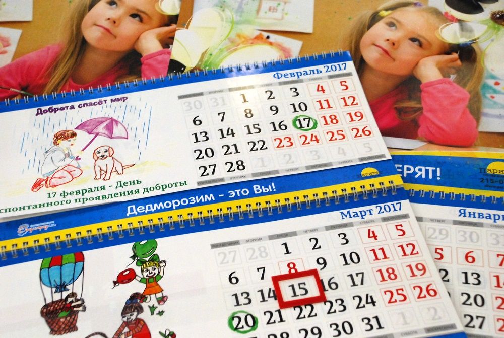 Темой календаря стали важные дни года. Вместо привычных праздников в календаре отмечены самые добрые дни — например, День спонтанного проявления доброты, Национальный день донора крови или Всемирный день сердца. Оформить календарь и нарисовать картинки для каждого праздника помогали воспитанники Осинского детского дома-интерната для детей с особенностями здоровья.