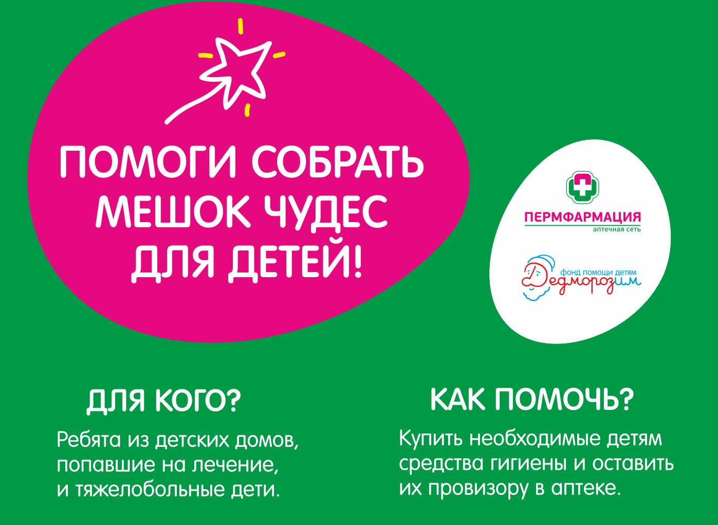 В сети «Пермфармация» началась подготовка ко дню защиты детей. Приходя в аптеки, можно совершить реальное дело в помощь больным ребятам — купить и передать для них средства гигиены. Все они попадут в мешок чудес, который 1 июня будет передан проекту «Больничные мамы».