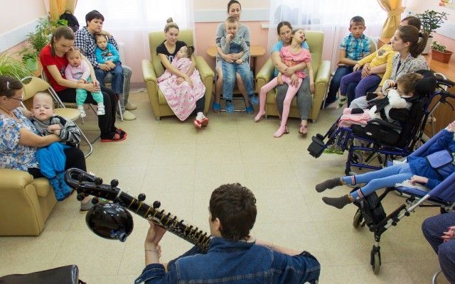 К ребятам из детского паллиативного отделения раз в неделю приезжают музыканты, художники и артисты. Они знакомят мальчишек и девчонок с самыми необычными музыкальными инструментами и техниками: играют на Счастье и Звуке дождя, рисуют витражи и помогают почувствовать музыку кожей.