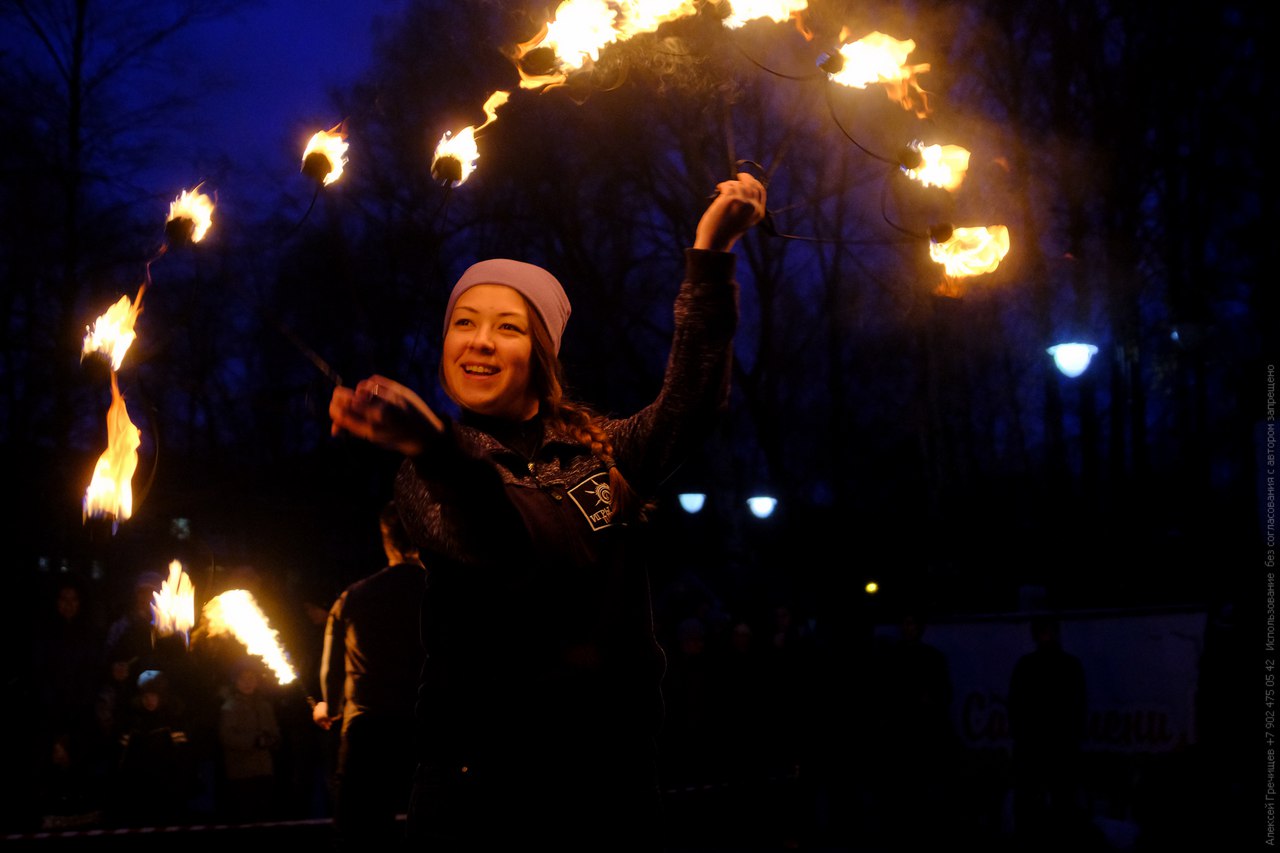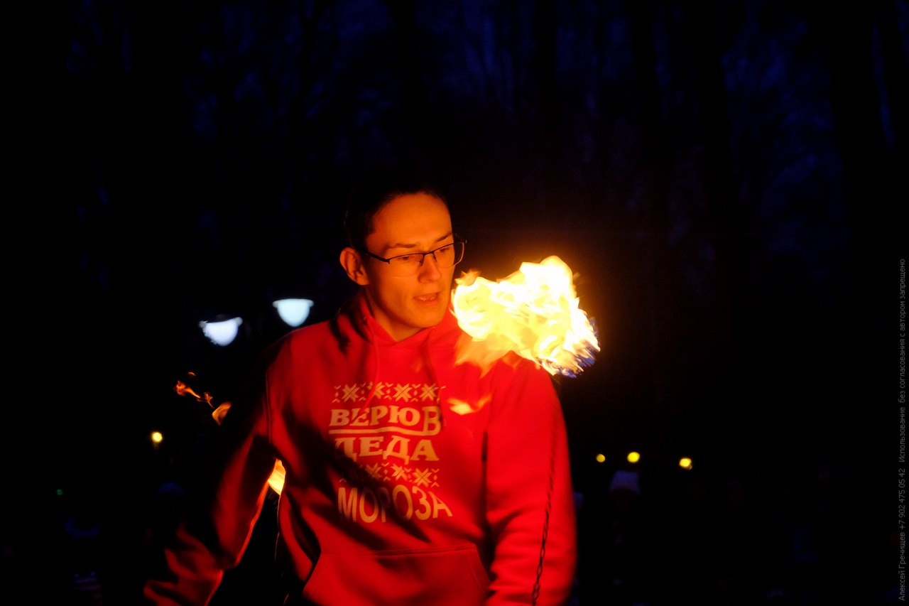 В воскресенье в саду Миндовского прошёл «благотворительный покрутон» — фаер-шоу под открытым небом. В течение всего вечера зрители могли оставить посильную сумму в копилке детского здоровья «Дедморозим».