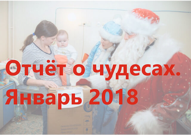 Январь — месяц хотя и праздничный, но не менее чудесный, чем остальные. И всё благодаря пермякам. Мы подводим итоги первого месяца наступившего года поздно и приносим извинения, что задержались с отчётом (можете запустить в нас мандарином). И всё же мы считаем, что делать отчёт раз в год это слишком редко. Вы успеваете совершить столько важных чудес для детей, что рассказывать об этом хочется чаще! Например, раз в месяц. Теперь отчёты о работе «Дедморозим» будут регулярными и будут публиковаться в социальных сетях и на сайте фонда ежемесячно.