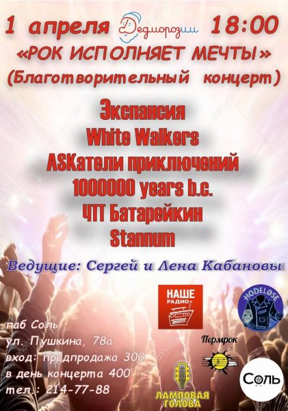 В воскресенье, 1 апреля, в пабе «Соль» пермские рок-музыканты организуют концерт в поддержку Вики Михалевой. Мечту девочки расти здоровой будут исполнять музыкальные группы «Экспансия»White Walkers«ASKатели приключений»1000000 years b.c.ЧП Батарейкин и Stannum.