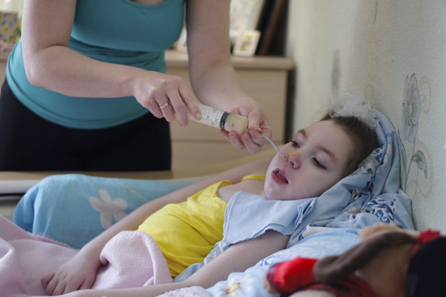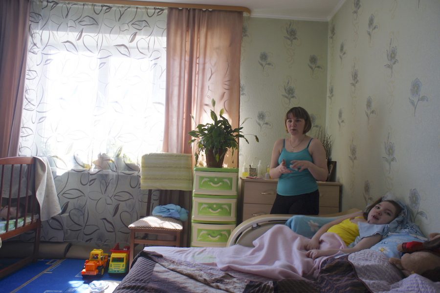 «Наш день начинается в пять утра, когда Даша начинает задыхаться. Я делаю санацию и ингаляцию, пою и кормлю Дашу, потом младшего сына, — рассказывает мама Оля. — Днём каждые полтора часа даю лекарства и чай из шприца. Труднее всего по вечерам, потому что около пяти вечера Даша начинает кричать, начинаются приступы. Ну и купание пока доставляет нам массу неудобств, потому что Даша уже тяжёлая, трудно удержать её. Раньше мы ездили в баню, в деревню неподалёку, но сейчас даже не выходим на улицу — без аспиратора Даша может захлебнуться мокротой».