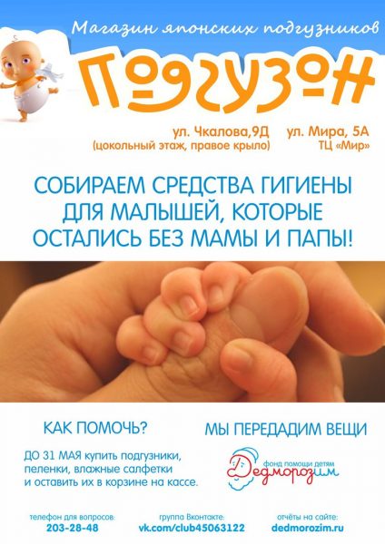 До 31 мая в магазинах «Подгузон» действует сухой закон: посетители этих магазинов берут за правило заботиться о сухих днях и ночах малышей, оставшихся без родителей в больнице. В «Подгузонах» вы можете купить пелёнки, подгузники, влажные салфетки, присыпки и другие необходимые средства гигиены и оставить их на кассе магазина — все собранные товары отправятся на помощь подопечным «Больничных мам». Таких чудесных «Подгузонов» в Перми два: на ул. Чкалова, 9Д (цокольный этаж, правое крыло) и на ул. Мира, 5А (в ТЦ «Мир»). Узнать подробности можно по телефону 203-28-48 или в группе магазина Вконтакте.