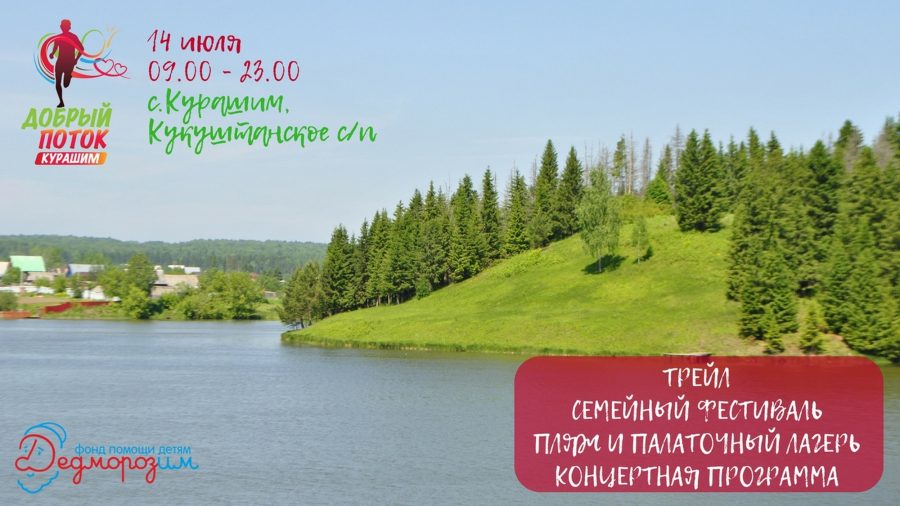 14 июля на берегу Курашимского пруда состоится благотворительный фестиваль «Добрый поток». Для участников предусмотрен детский забег 400 метров (дети 7-13 лет), дистанции на 3, 12 и 24 километров. Стоимость участия — 100, 500, 600 и 600 рублей соответственно.