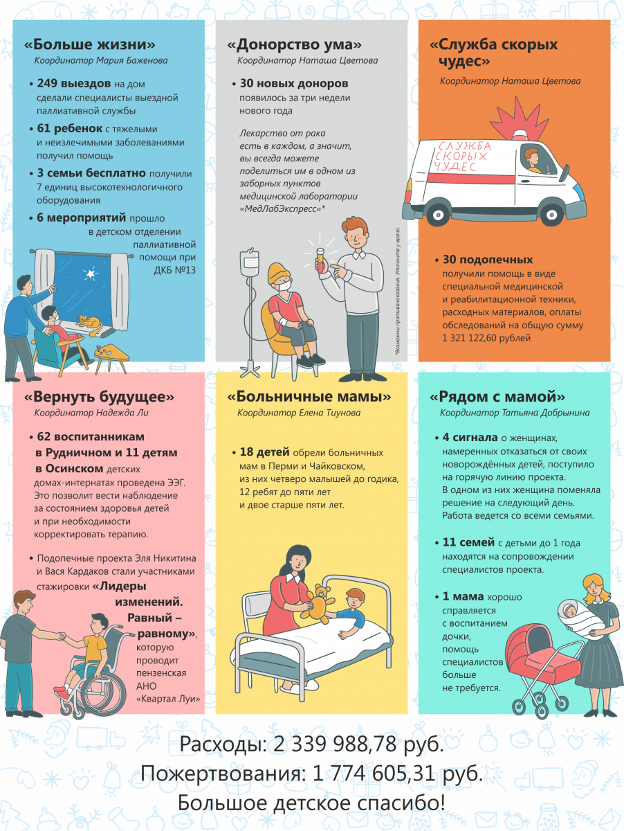 Спасибо всем, кто помог организовать интересный досуг для семей с детьми с неизлечимыми заболеваниями: баскетбольному клубу «Парма» за приглашение подопечных проекта на матчи, а также участникам и организаторам благотворительного арт-фестиваля «Всякое добро»! Благодарим главное бюро медико-социальной экспертизы по Пермскому краю за оперативность во взаимодействии и помощь в улучшении качества жизни детей с тяжёлыми неизлечимыми заболеваниями. Выражаем благодарность фонду «Подари жизни» за сотрудничество при оказании помощи детям с онкозаболеваниями, проходящими лечение в федеральных центрах.