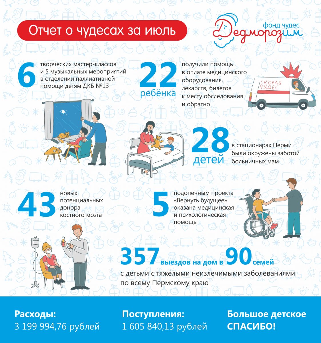 В июле 17 тяжелобольных детей получили помощь в виде покупки медицинского оборудования и расходных материалов к нему, а также технических средств реабилитации. 4 семьи получили помощь в оплате билетов к месту консультации специалистов или обследованию и обратно. 1 семья получила помощь в приобретении жизненно необходимого лекарственного препарата.