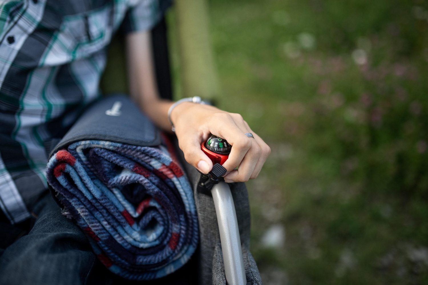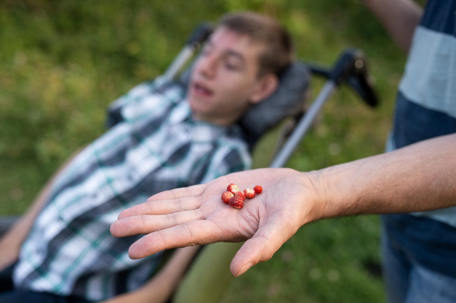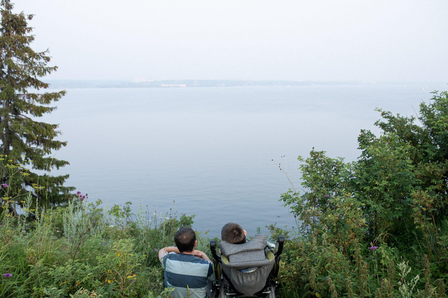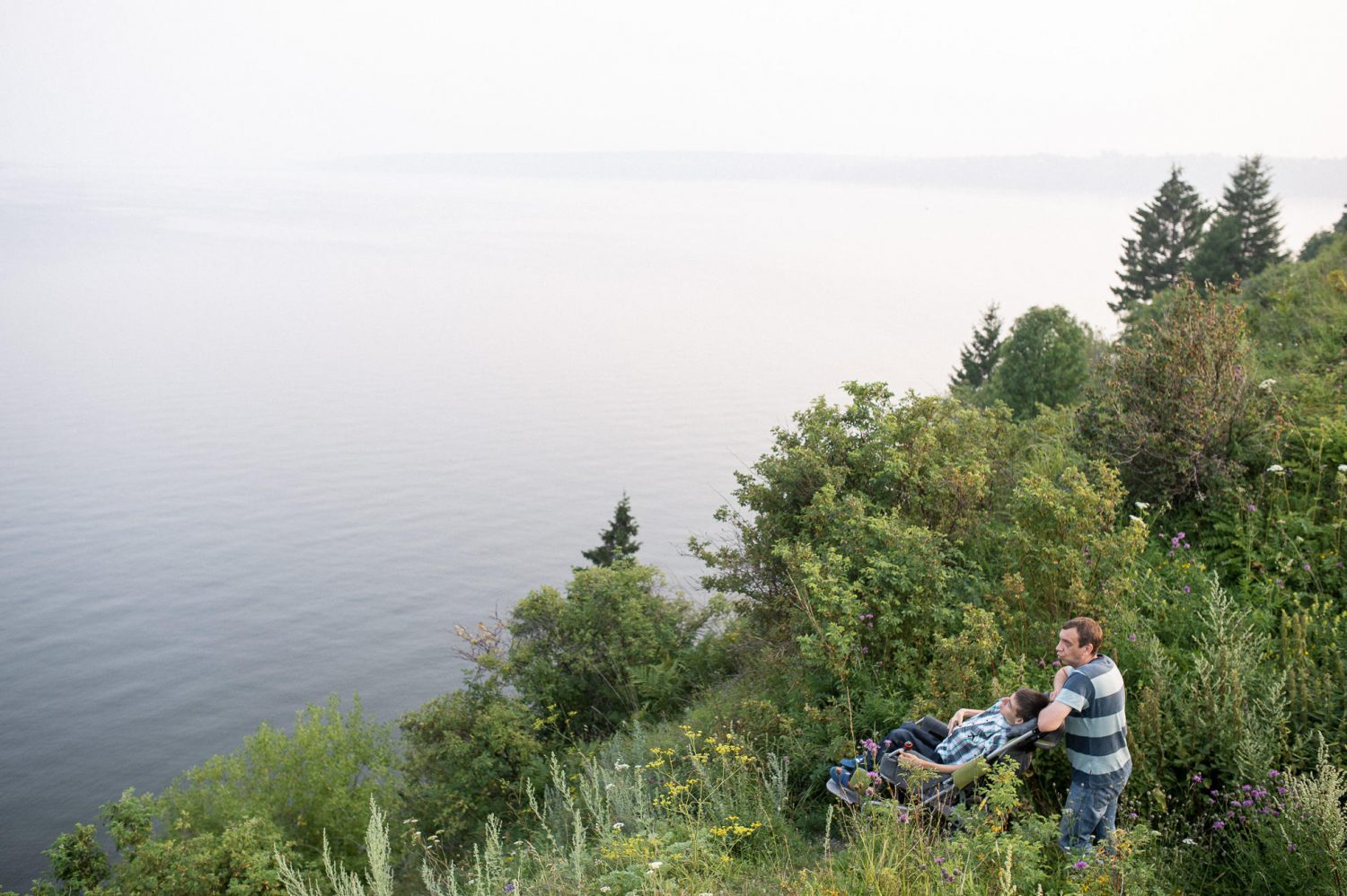 К слову, этот материал мы записываем в не самой доступной точке — в окрестностях мыса Стрелка с 30-метровыми холмами и резкими спусками. Влекомые жаждой приключений, Евгений и Егор сразу соглашаются на наше приглашение отправиться в новое путешествие. И вот мы гуляем по просторам, где, по легенде, родился пророк Заратустра, едим дикую клубнику и глубоко вдыхаем душистый аромат летнего вечера. Чтобы взять от этой поездки максимум, нам нужно подняться на главную точку — сам мыс на месте слияния Камы и Чусовой. Вершина скалы с довольно узкой для инвалидной коляски площадкой поддаётся с первого раза: на помощь приходят случайные прохожие — с помощью восьми дружеских рук Егор покоряет Стрелку и замирает от высоты и от красоты закатного солнца.
