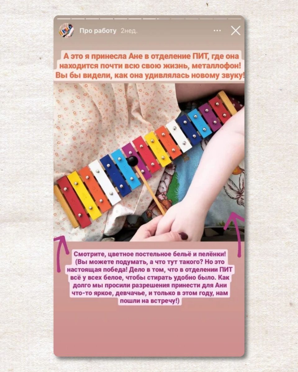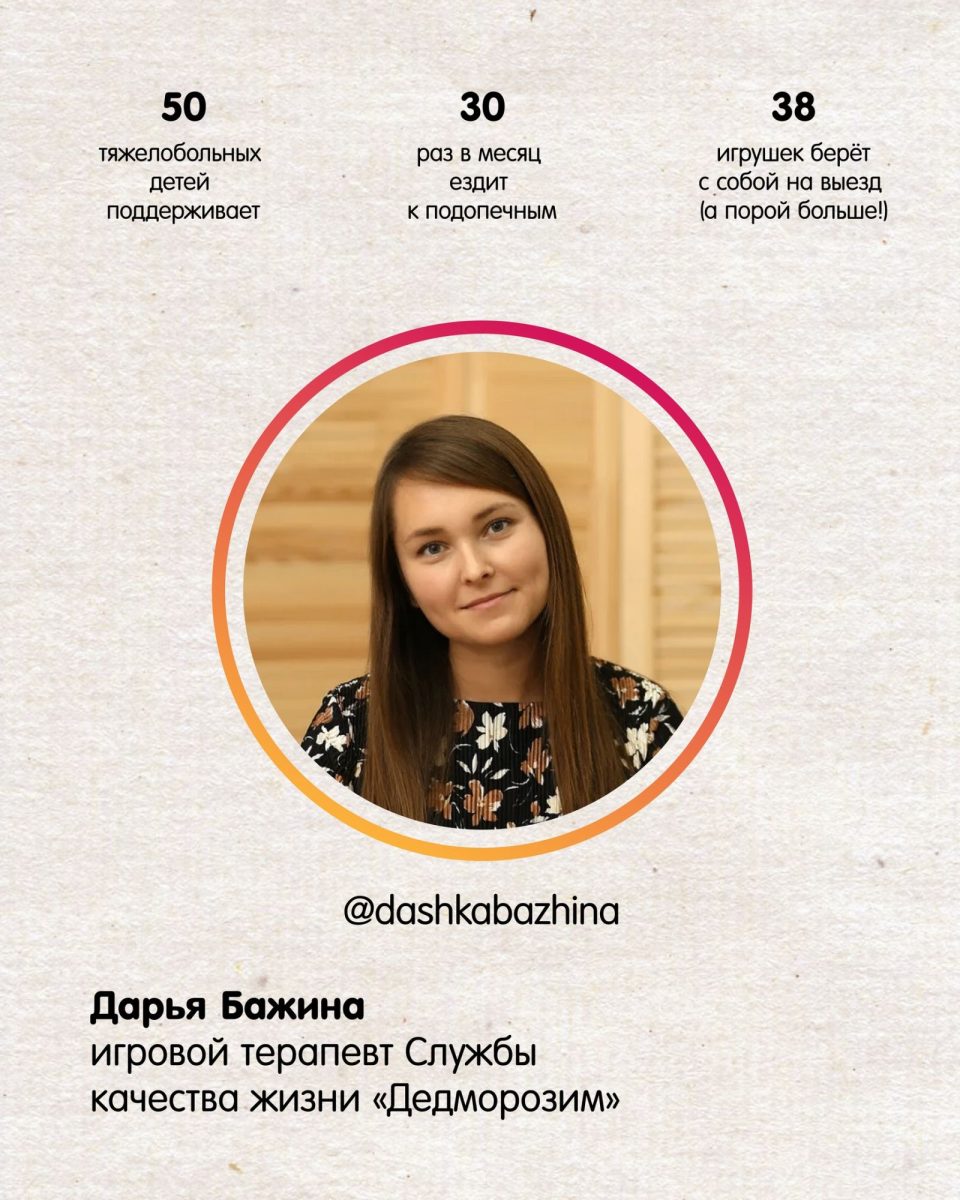 Игровой терапевт Даша Бажина — любимый гость подопечных Службы качества жизни «Дедморозим». Она всегда приносит для ребят необычные игрушки и музыкальные инструменты, придумывает интересные игры. А ещё для многих тяжелобольных детей Даша становится другом, с которым можно болтать обо всём на свете. Как игры меняют жизнь детей? Даша рассказала в своих сториз.