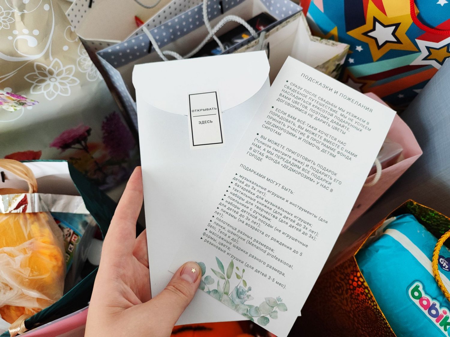 «Я увидела пост в соцсети у знакомой: на свадьбу они попросили подарить вещи для животных из приюта вместо цветов. Захотелось сделать что-то похожее, но для детей, — делится Надя, — Были переживания, что гости не поймут. Но все нас поддержали, и каждый принёс полезную посылку для ребят. Дарить цветы бессмысленно — они завянут. А средства гигиены помогут детям».