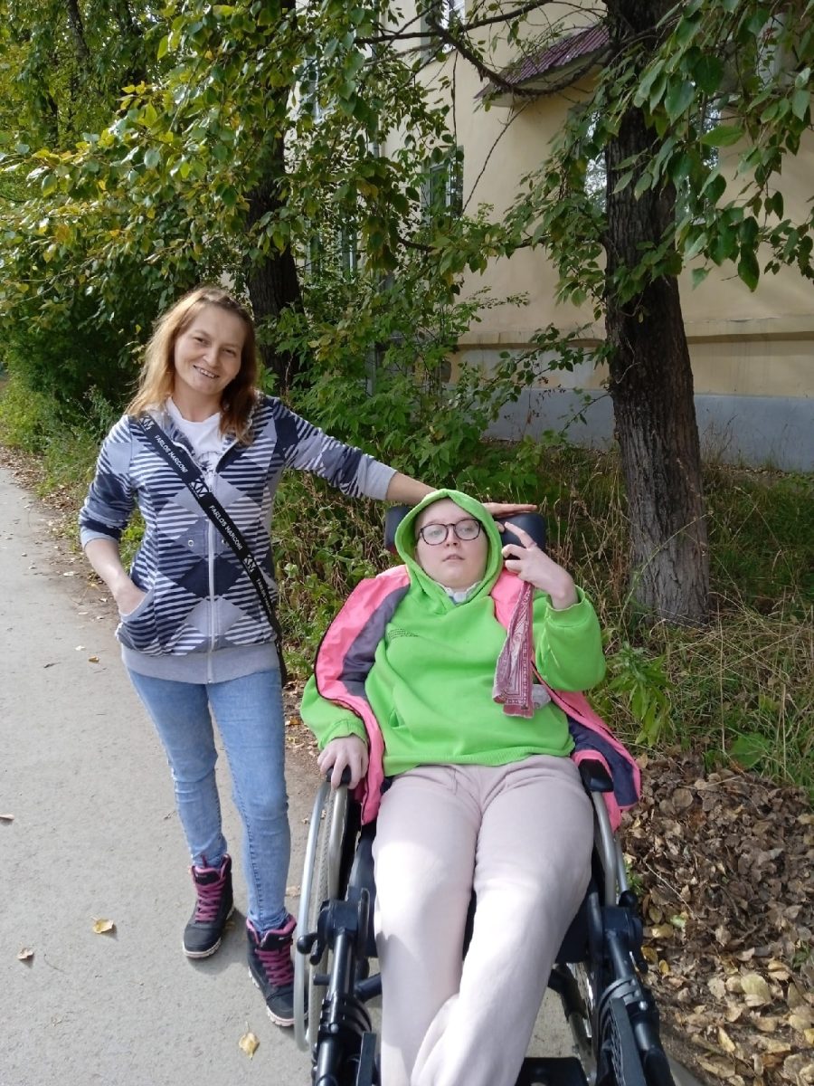 Когда Ева стала более активной, мы начали делать не просто разминку, а гимнастику. Вся команда Службы качества жизни “Дедморозим” не оставляла нас. Приезжали врач и медсестра, психологи работали с Евой, объяснили: она должна любить себя, какая бы она ни была — и у неё появилась цель. Ева мечтает закончить колледж и побывать на море.