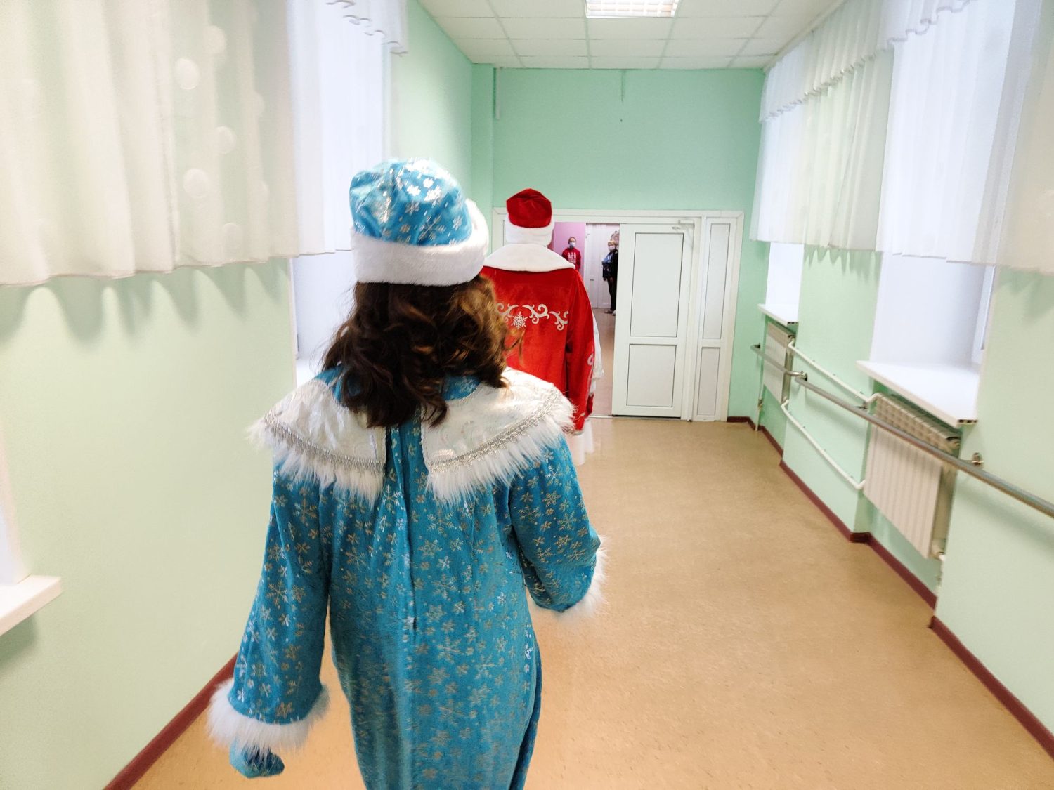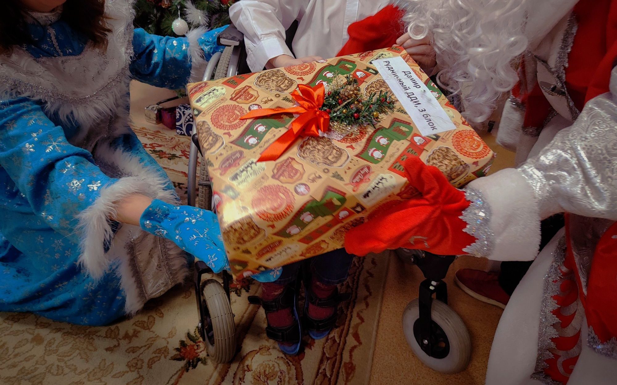 На первом этаже в блоке ДЦП оживление слышно уже издалека. На громкое дедморозовское «Ну, здравствуйте, ребята!» они отвечают широкими улыбками, сидя нарядными в больших креслах с колёсами. Кто-то ёрзает, кто-то молча внимательно следит за гостями, а мальчик Дамир только напряжённо слушает, потому что природа не предусмотрела для него возможность видеть. Он не спешит брать подарок, осторожно касается рукой гладкой упаковочной бумаги. Прикосновения ничего не могут сообщить ему про цвет и рисунок коробки, а вот еловая ветка с шишкой на ней расскажет гораздо больше. Не всегда от чуда ждут яркости и цвета. Порой ему достаточно быть мягким, нежным, тёплым.
