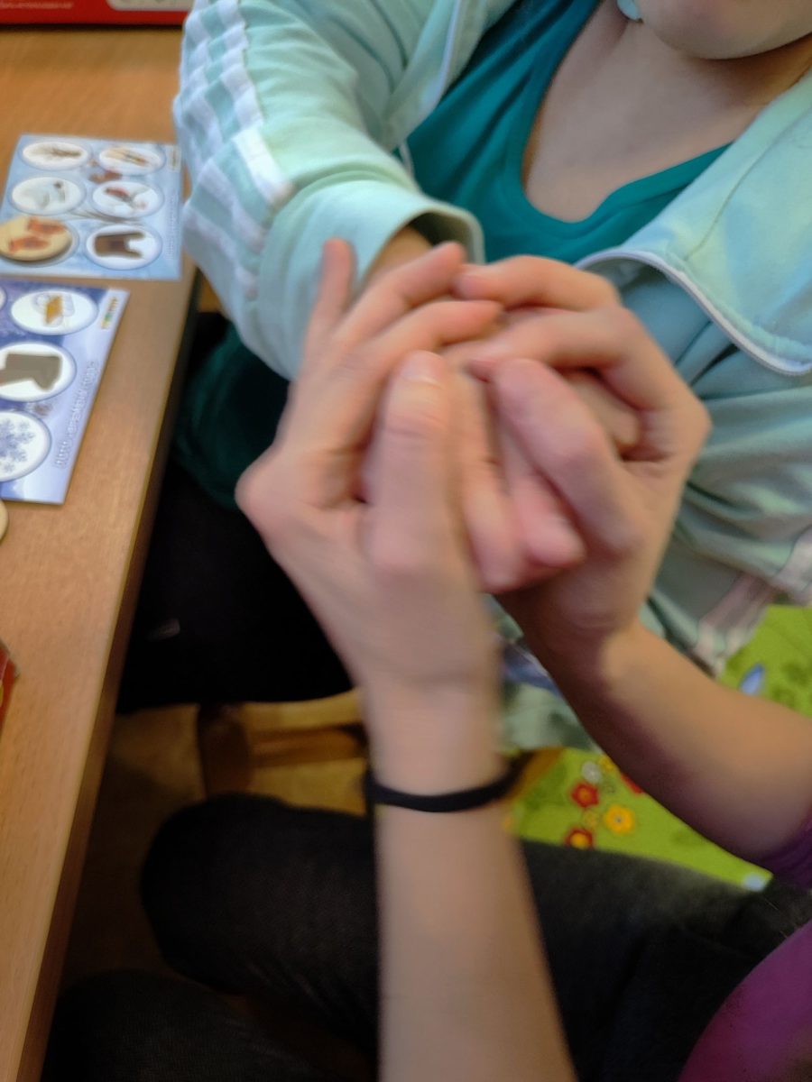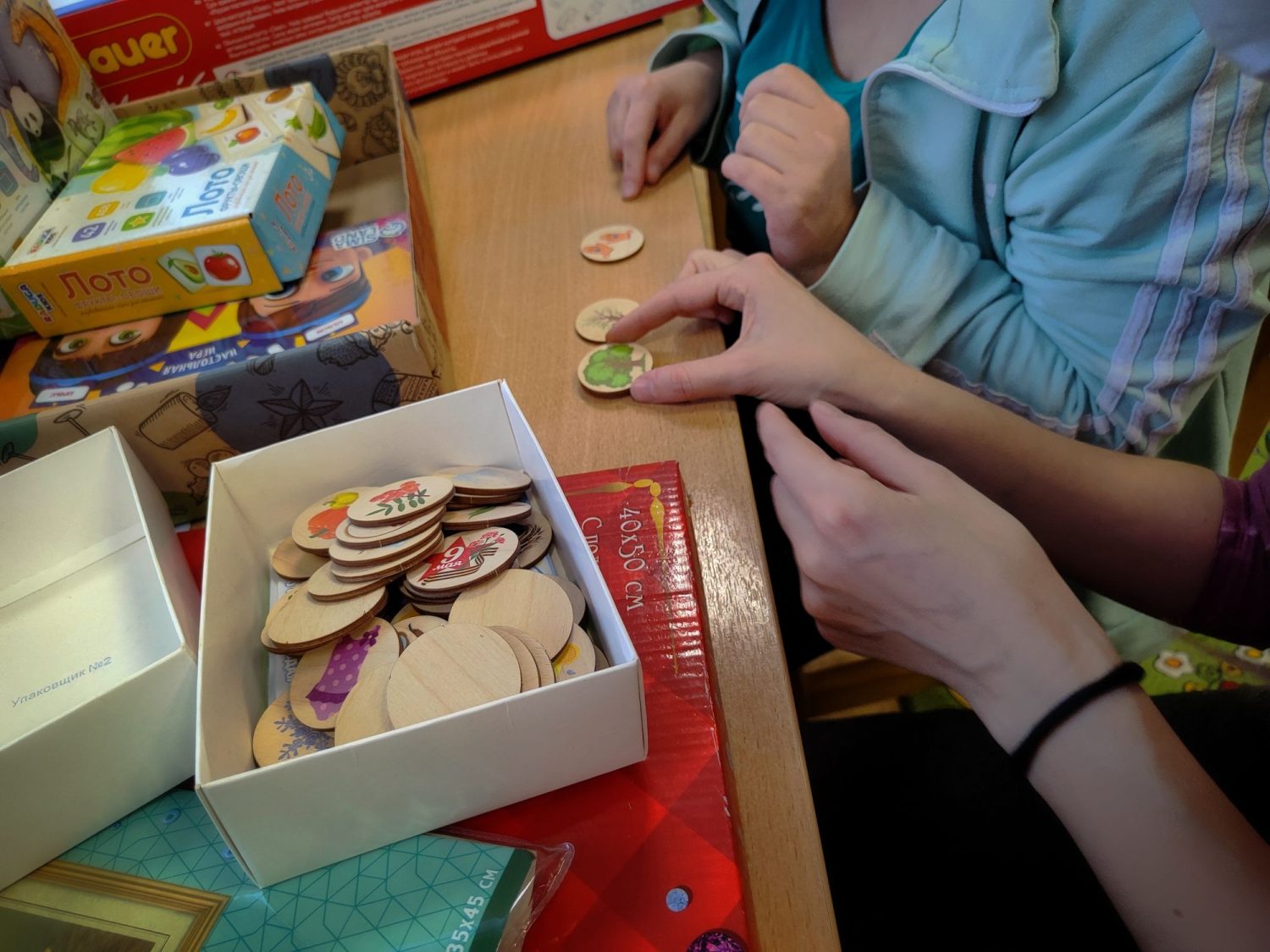 У нас ещё остается время перед отъездом и мы возвращаемся к старшим ребятам, чтобы немного пообщаться. При входе в комнату меня обнимает та сама улыбчивая Олеся: то ли узнает во мне Снегурочку без костюма, то ли просто воодушевлена необычным воскресеньем и общим ажиотажем товарищей. Это не так важно, главное, что у нас есть полчаса, чтобы поиграть. Мы садимся с Олесей рядом, чтобы распечатать её подарок. В коробке лежит лото. Не спеша раскладываем вместе с Олесей карточки сначала с овощами и фруктами, потом с временами года. Разглядываем деревянные кругляши лото, на одном из которых нарисованы варежки.