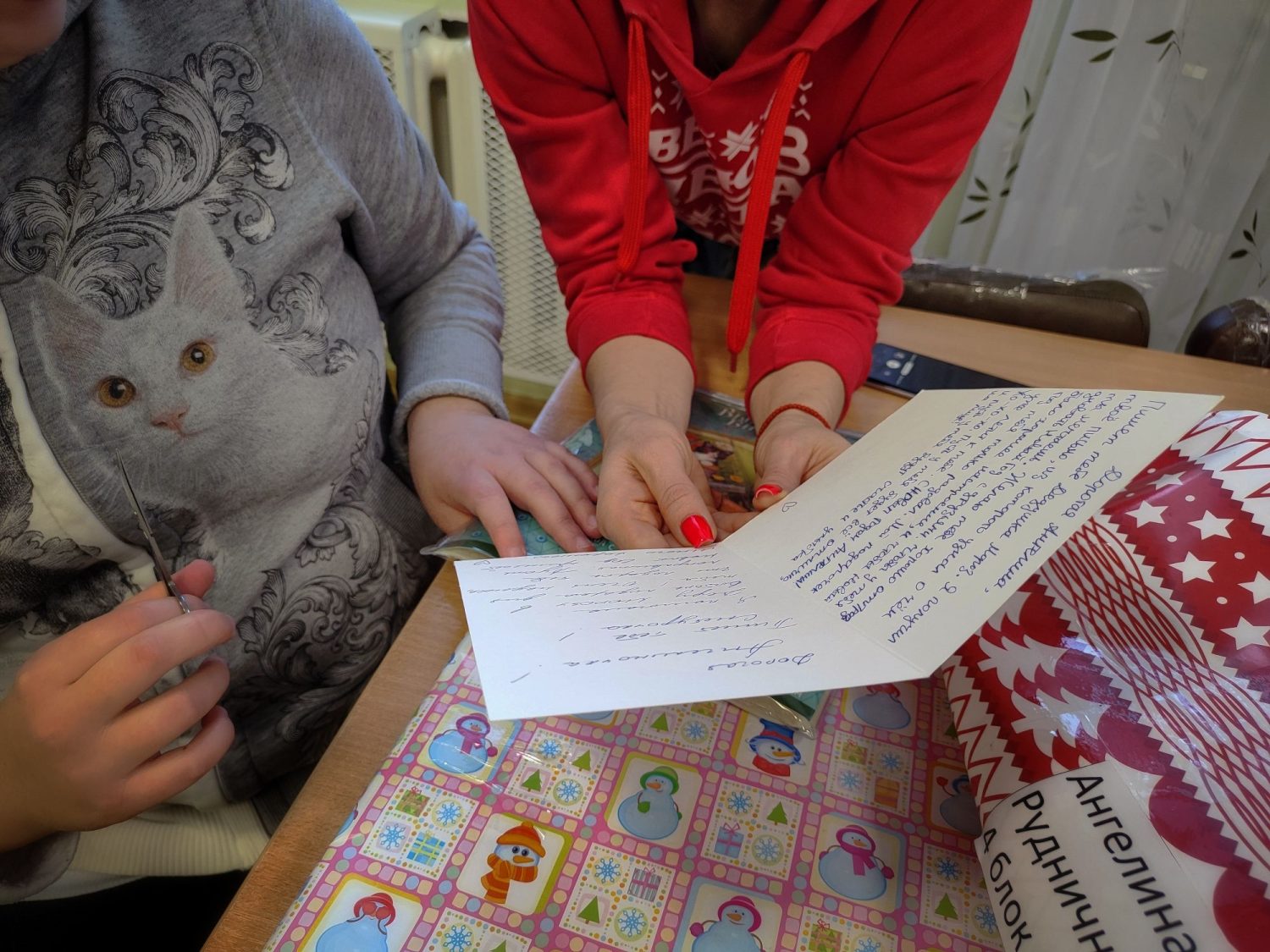 Девочка Лена в пышном белом платье радостно смеётся каждый раз, когда выносят чудеса в коробках и пакетах. Ей очень хочется, чтобы поскорее назвали её имя. Когда Дед Мороз протягивает Лене яркую коробку, замечаю, что к подарку сверху прикреплена открытка. Новогоднее чудо становится ещё чудеснее от того, что волшебник из далёкой Перми добавил тепла с помощью простого послания.