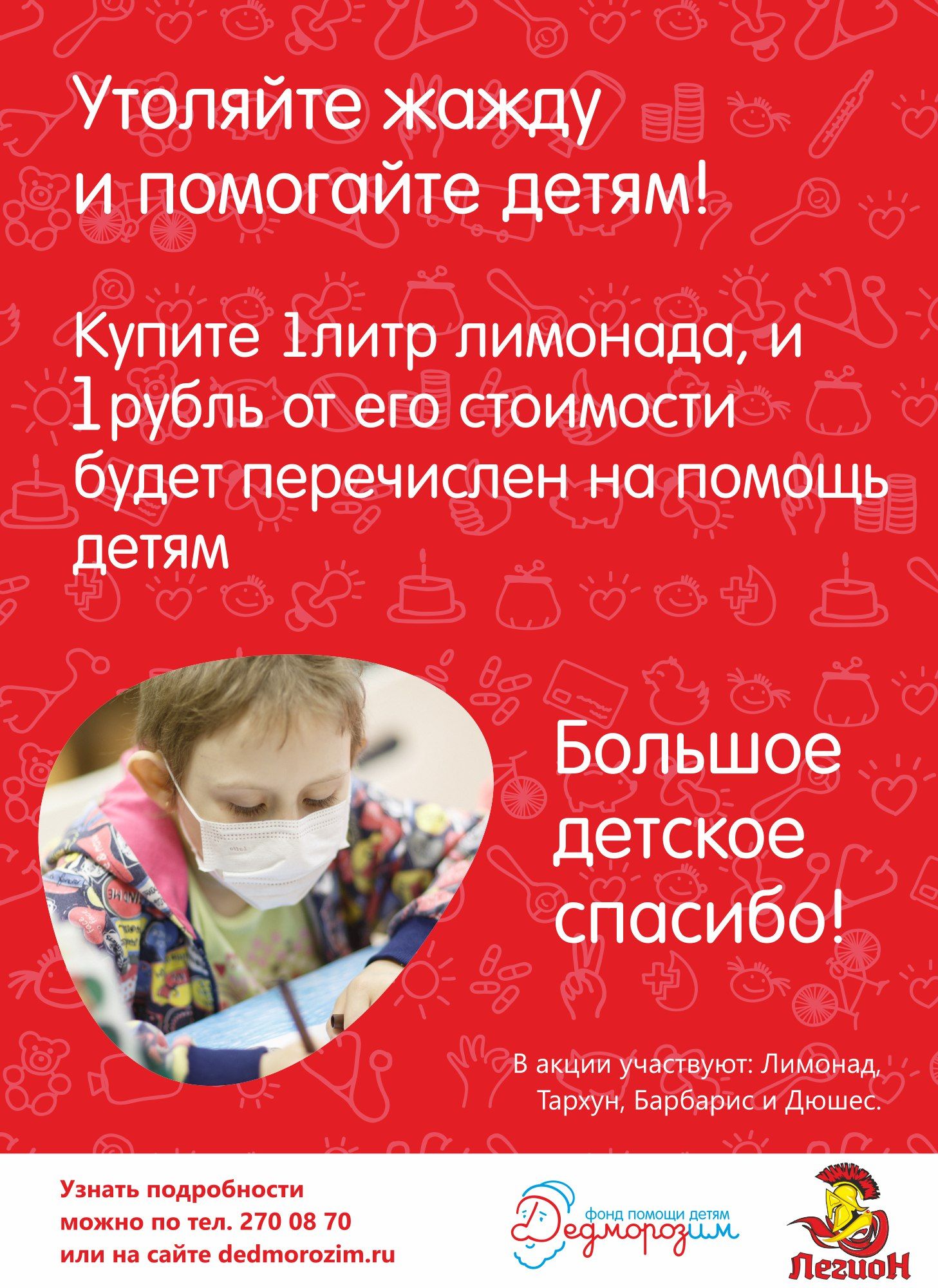 Как, например, газировки и лимонады компании «Легион», которая продает любимые напитки пермяков на разлив. С весны и до 31 августа компания будет отправлять 1 рубль от каждого проданного литра Дюшеса, Тархуна, Барбариса и Лимонада, Бразильского Крыжовника, Вишни-Миндаля и Клубника-Ананаса на помощь подопечным Службы скорых чудес «Дедморозим».